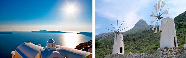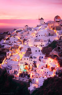 Santorini is totally unlike any other place on earth. The original circular island was blown apart nearly 3.000 years ago by a fierce volcanic eruption. Today one can only look and wonder at the beauty created by natural destruction. The island of the lost civilization of Atlantis, where you can see unforgettable sunsets and panoramic views... thus the lover’s paradise. The town of Fira’s whitewashed houses, narrow streets, open-air cafes and glittering boutiques cling to a steep cliff, accessible by cable-car or by donkey ride.